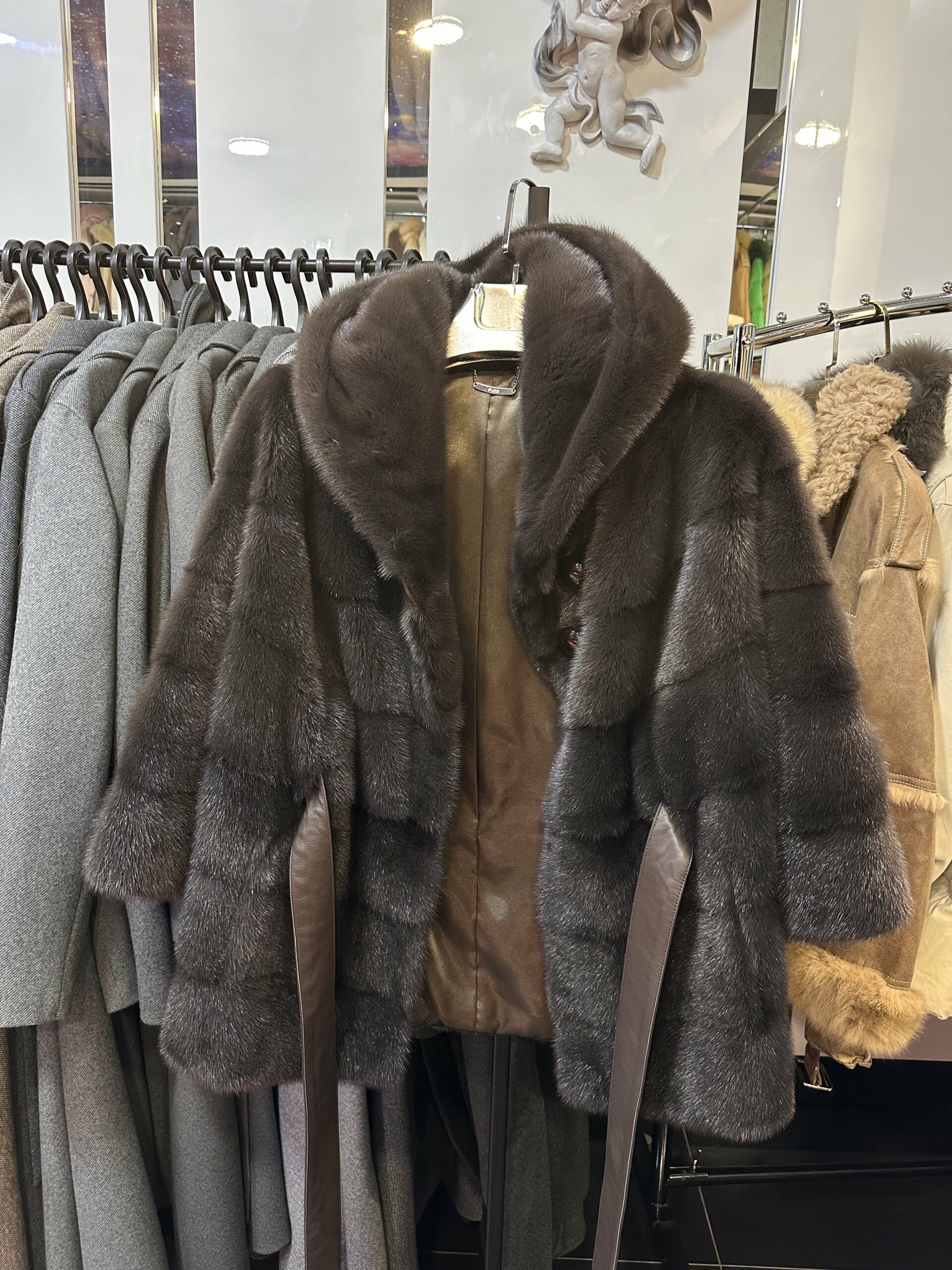 Эта шуба выполнена в глубоком тёмно-коричневом оттенке с благородным холодным отливом, который подчёркивает насыщенность и выразительность меха. Плотная, густая фактура выглядит ухоженно и дорого, создавая ощущение тепла и уюта с первого взгляда. Классический полуприталенный силуэт гармонично сочетается с укороченной длиной, делая модель практичной и элегантной одновременно. Объёмный воротник мягко ложится по линии плеч и шеи, добавляя образу статусности и визуальной глубины. Вертикальные кожаные вставки и пояс создают стильный контраст фактур, подчёркивая талию и добавляя современный акцент в классический дизайн. Эта шуба идеально подойдёт для городских образов, сочетая комфорт, функциональность и утончённую роскошь, и станет универсальным элементом гардероба на холодный сезон.