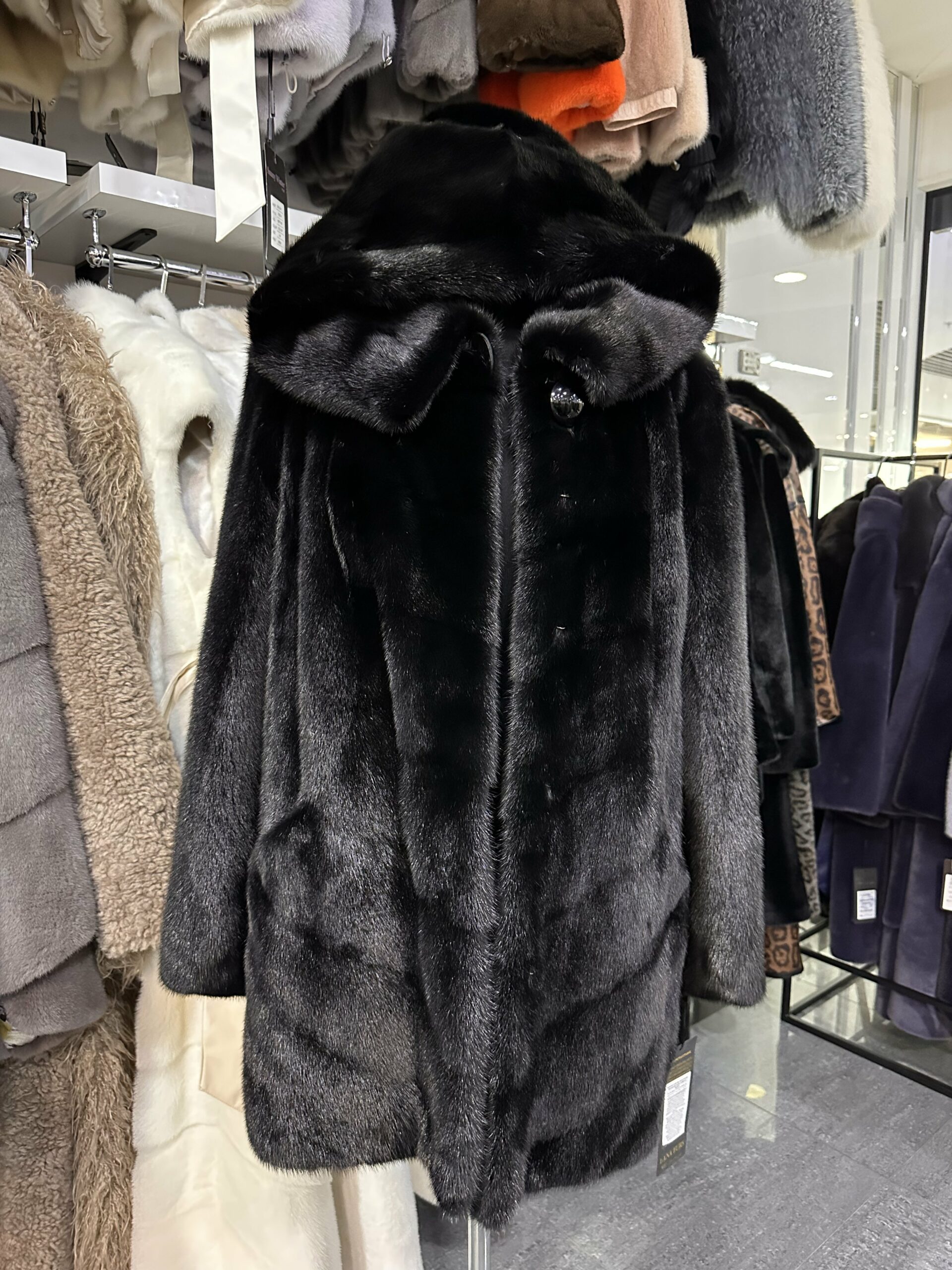 Эта шуба выполнена в глубоком чёрном оттенке с выразительной, плотной текстурой меха, которая подчёркивает её статус и безупречный внешний вид. Модель дополнена объёмным капюшоном, мягко обрамляющим линию лица и создающим ощущение уюта и защищённости в холодное время года. Прямой, слегка свободный крой обеспечивает комфортную посадку и делает силуэт элегантным и современным. Вертикальная раскладка меха визуально вытягивает фигуру, придавая образу стройность и благородную строгость. Мех отличается густотой, ровным ворсом и деликатным естественным блеском, что усиливает ощущение премиального качества. Эта шуба станет универсальным элементом гардероба, идеально подходящим как для повседневных городских образов, так и для более статусных выходов, подчёркивая уверенность, вкус и индивидуальный стиль своей обладательницы.