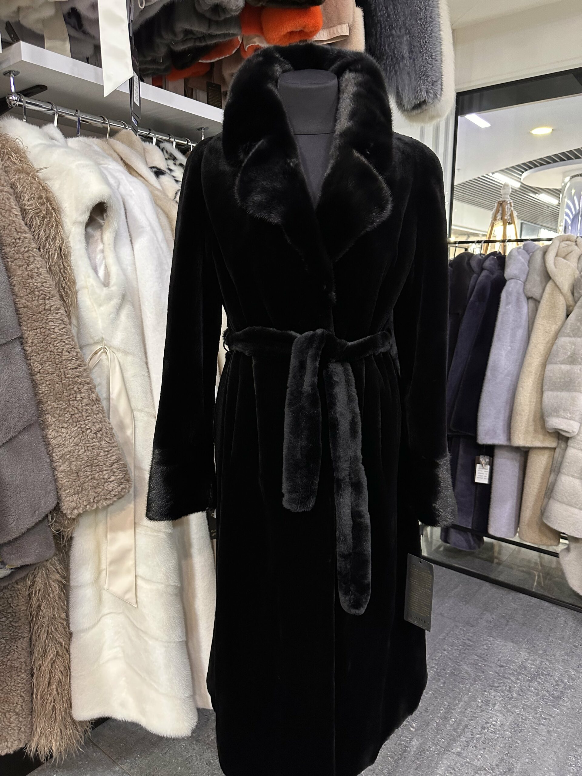 Элегантная длинная шуба выполнена в насыщенном чёрном цвете и отличается безупречной лаконичностью линий. Модель имеет приталенный силуэт, подчёркнутый меховым поясом, который мягко акцентирует талию и создаёт женственный, утончённый образ. Воротник выполнен из более густого и объёмного меха, красиво обрамляет шею и зону декольте, придавая изделию дополнительную выразительность и ощущение роскоши. Длина ниже колена делает эту шубу особенно практичной в холодный сезон, обеспечивая тепло и комфорт. Рукава классической формы с аккуратной отделкой сохраняют гармонию общего силуэта. Мех отличается плотностью, однородной текстурой и благородным естественным блеском, подчёркивающим высокое качество изделия. Эта модель идеально подойдёт для женщин, которые ценят классику, статус и универсальность, легко сочетаясь как с повседневными, так и с элегантными вечерними образами.
